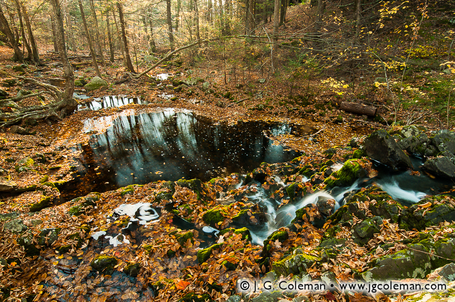 Having drained a broad expanse of wild, unbroken forest in Simsbury and Granby, an unnamed tributary of Bissell Brook fervently splinters into streams of whitewater as it cascades some 20 feet down coarse ledges of bedrock.